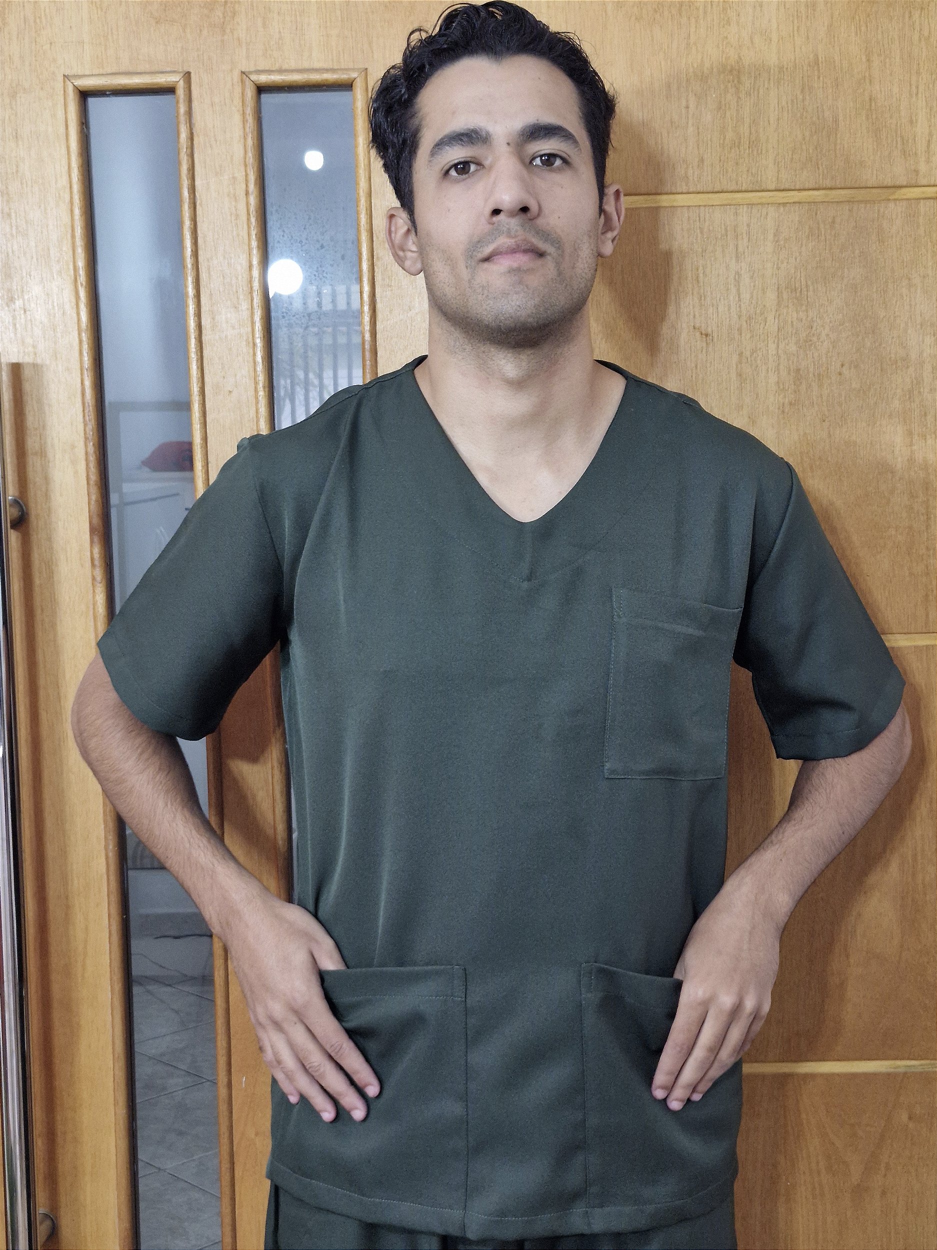 - Camiseta Cirúrgica, com gola V, com um bolso superior e dois bolsos inferiores frontais;