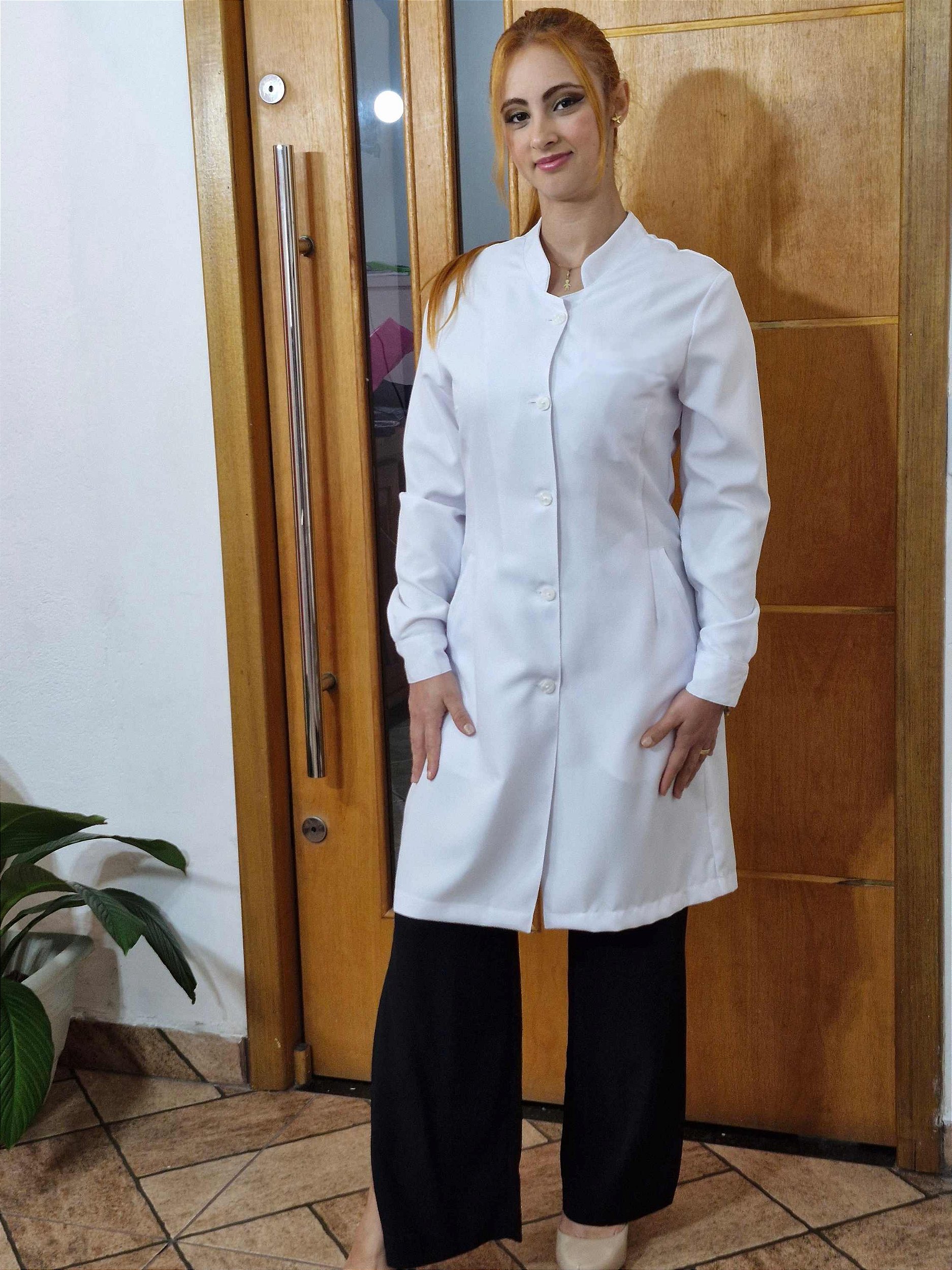 - Jaleco feminino composto por punho nas mangas, dois bolsos inferiores laterais e com gola padre.