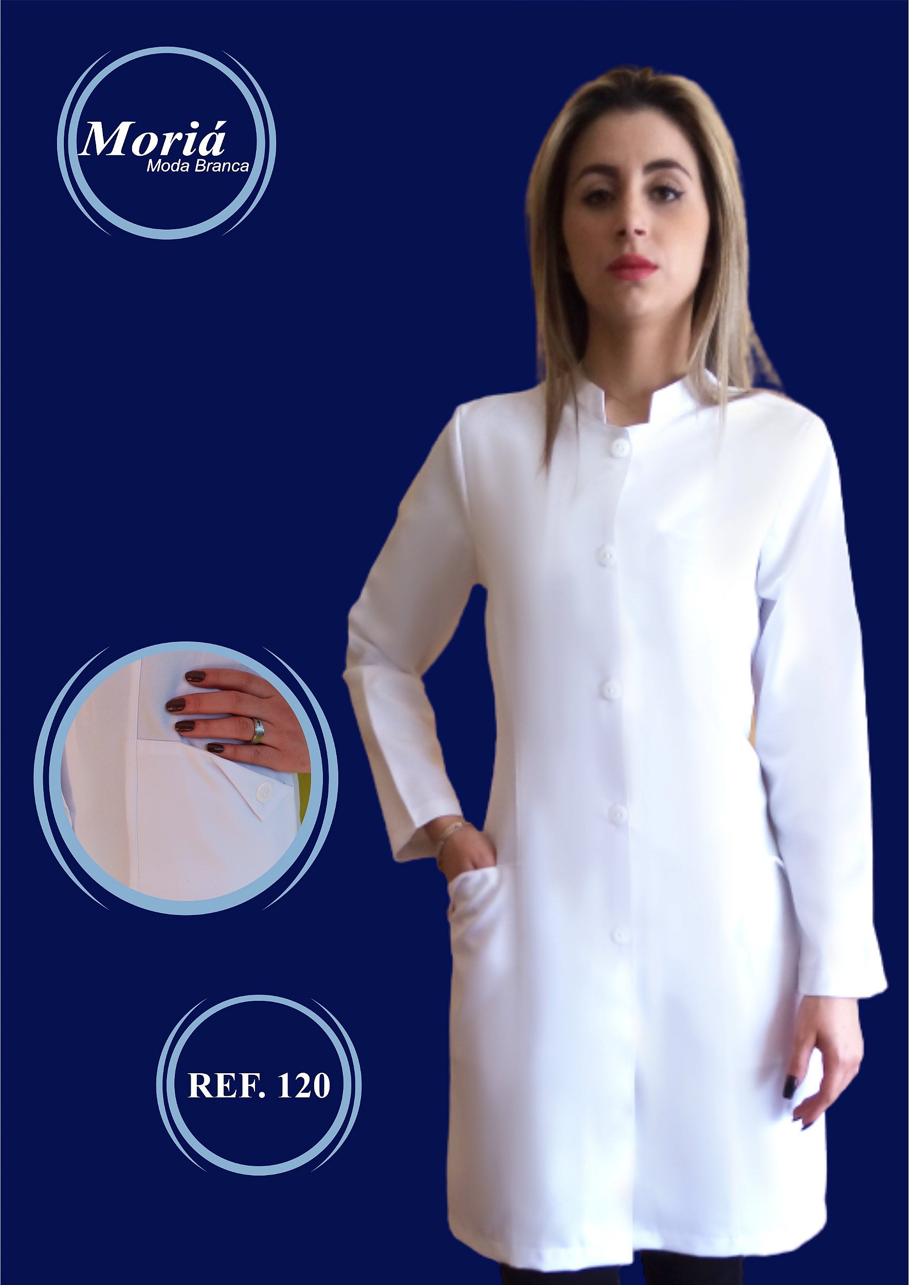 - Jaleco feminino acinturado, composto por gola padre, dois bolsos inferiores com botão e caimento perfeito.