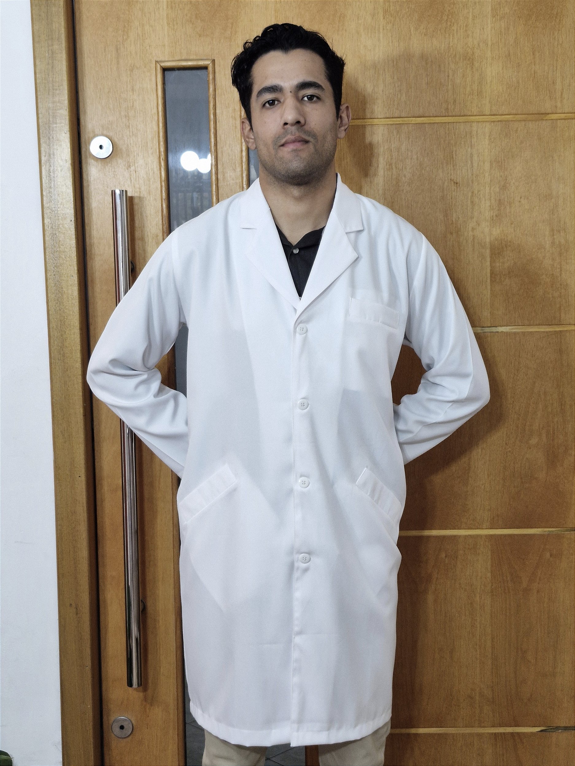 - Jaleco Masculino composto por: gola esporte, dois bolsos inferiores e um bolso superior frontal, cinto pequeno, saindo do recorte traseiro, com dois botões.