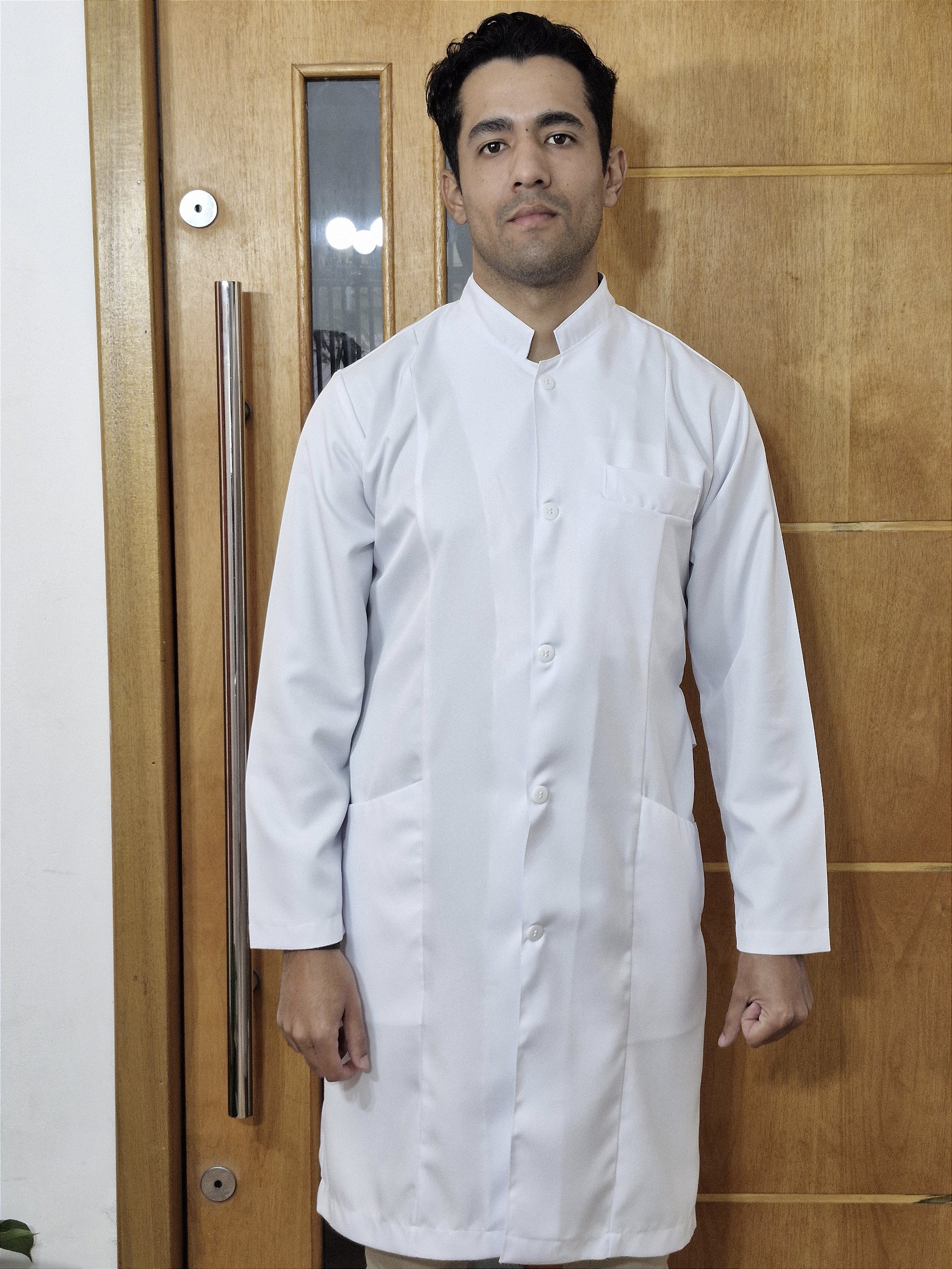 - Jaleco Masculino composto por: gola padre, dois bolsos inferiores e um bolso superior frontal, dois botões no cinto traseiro.