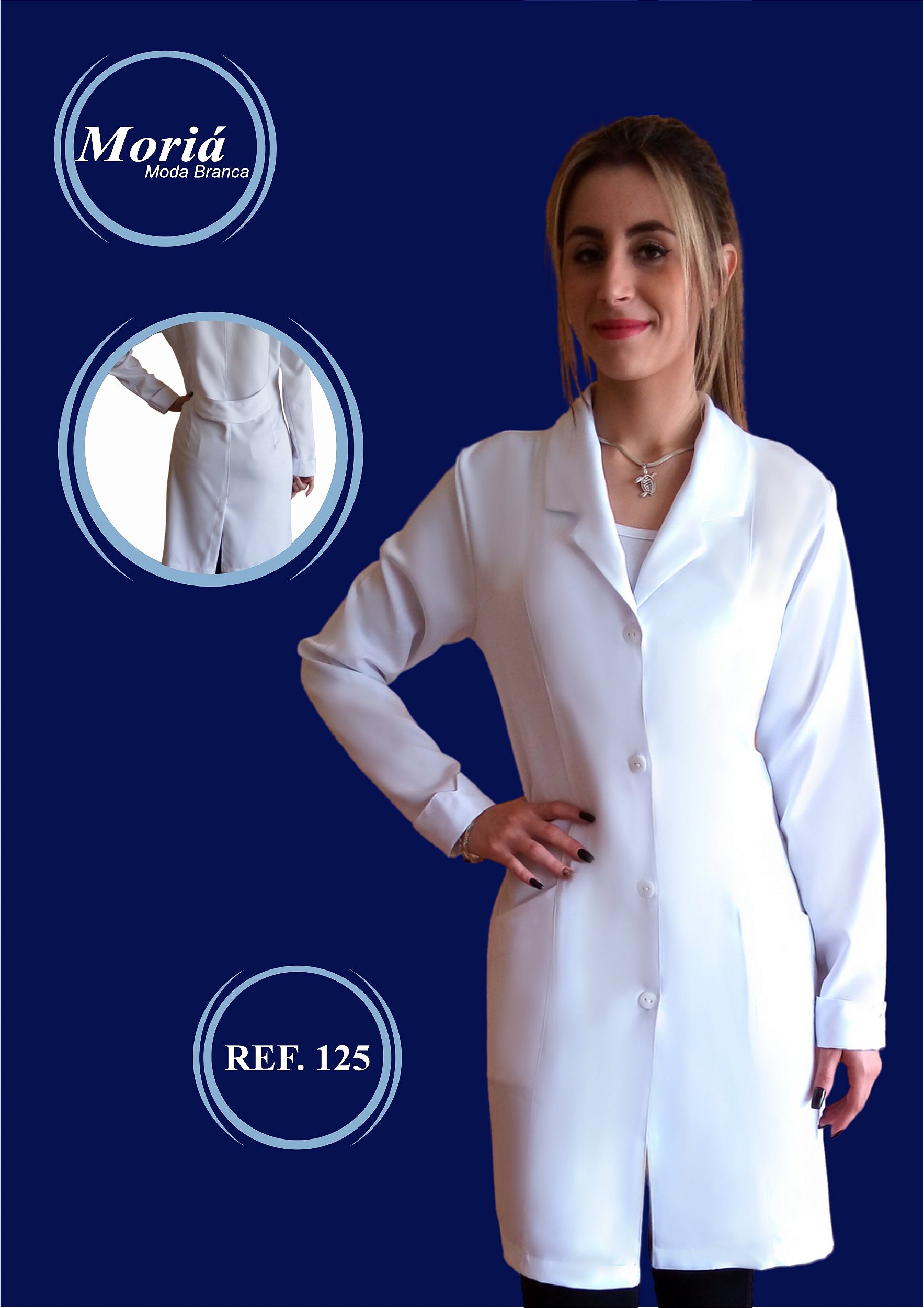 - Jaleco feminino acinturado, com dois bolsos embutidos inferiores.