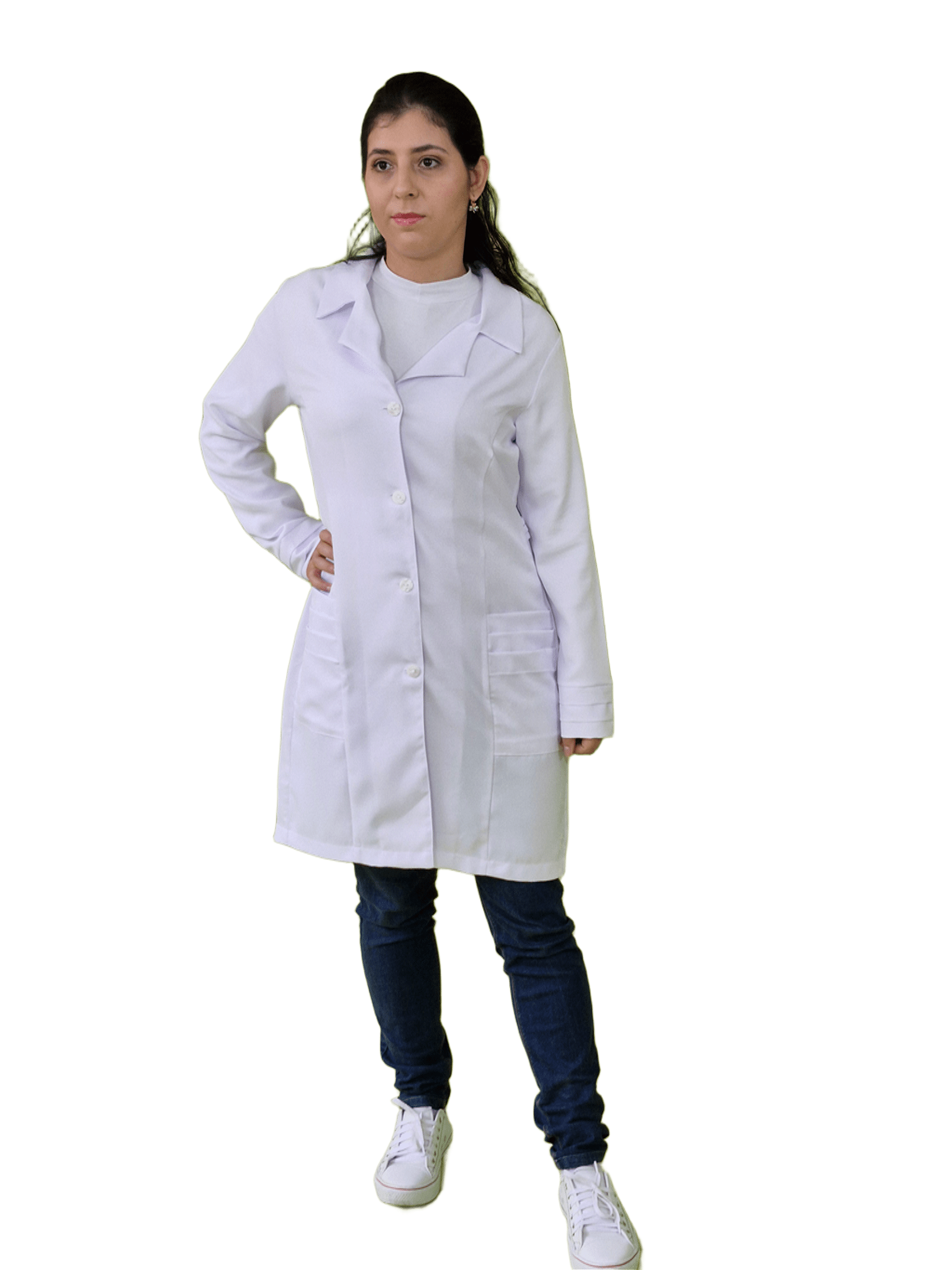 - Jaleco feminino acinturado, possui pregas nas mangas e nos bolsos inferiores, também possui bolso embutido, superior esquerdo.