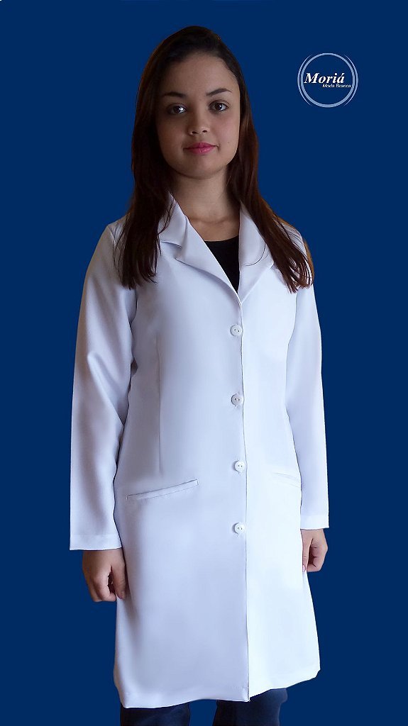 - Jaleco feminino composto por gola esporte e dois bolsos inferiores.