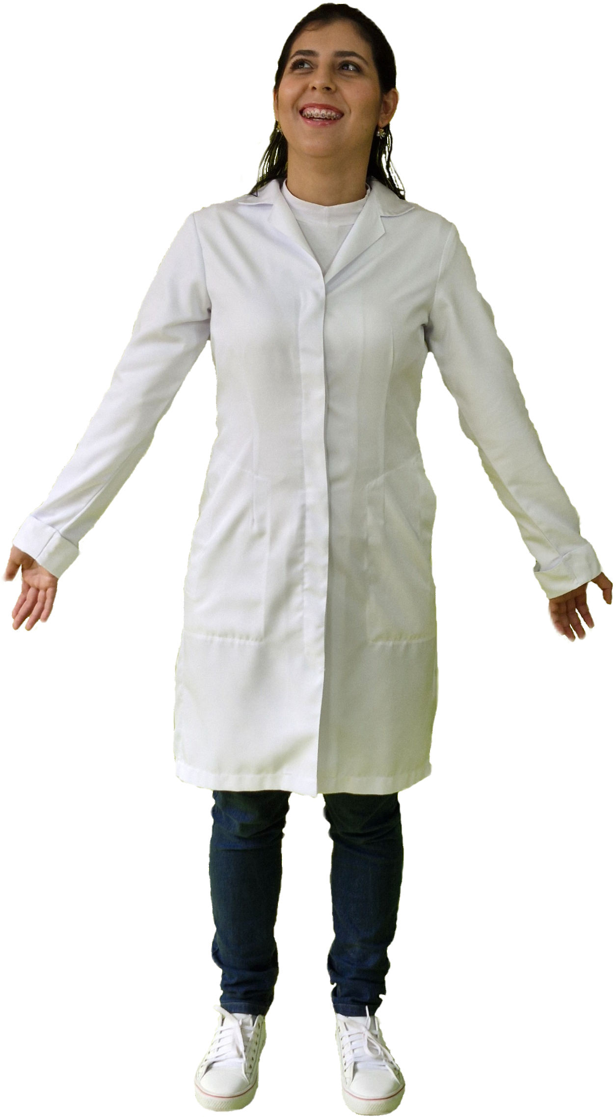 - Jaleco feminino acinturado, composto por dois bolsos inferiores laterais, um bolso superior embutido, cobertura de botões, punho dobrado e gola esporte.